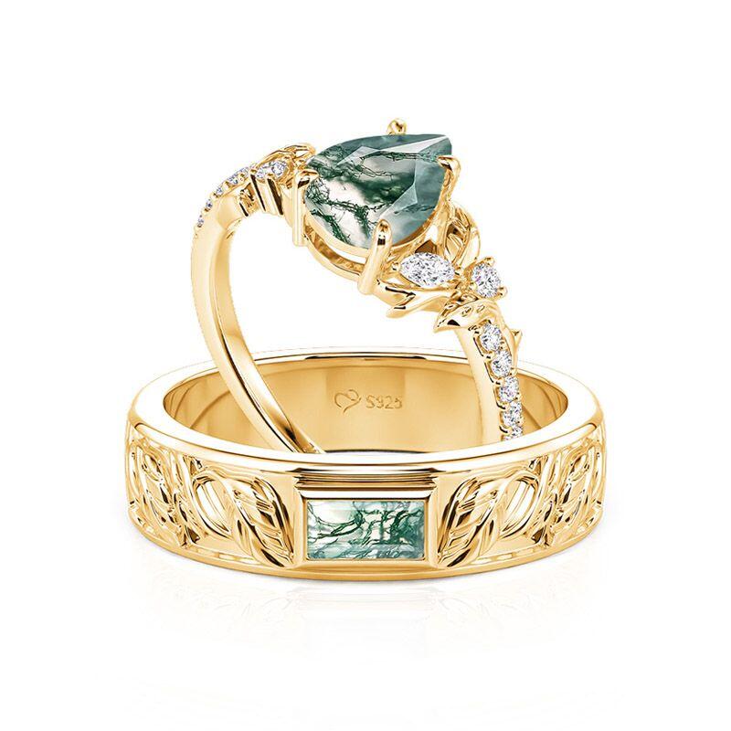 Dieses Jeulia von der Natur inspirierte Paarring-Set mit gravierten Blättern aus Moosachat ist aus 925 Sterling-Silber kunstvoll gefertigt. Durch die Verschmelzung von Moosachat und Naturelementen interpretiert dieses Moosachat-Ringset eine beständige Liebe, die so standhaft ist wie Moosspuren. Der Herrenring weist einen horizontal ausgerichteten rechteckigen Moosachat auf, während der Damenring einen vertikal ausgerichteten birnenförmigen Moosachat präsentiert. Zusammen getragen, erschaffen die beiden Steine ein visuelles Gedicht von „Himmel und Erde, die einander antworten“. Das Band ist mit verschlungenen Rankenmustern kunstvoll graviert. Dieses passende Paarring-Set ist perfekt für den Austausch von Gelübden bei Hochzeiten mit Naturthema. Werden sie täglich getragen, schimmern und verändern sich die Moosmuster mit dem Licht, als würden sie atmen.