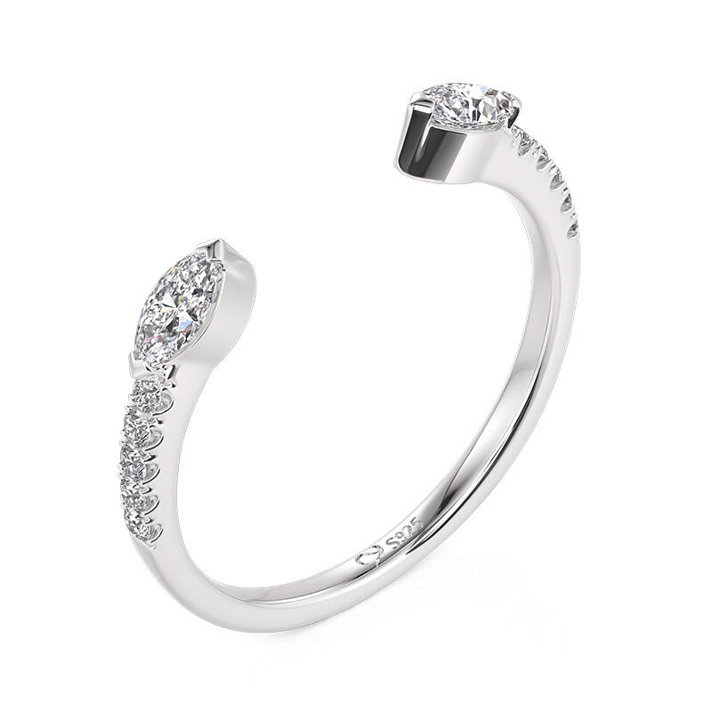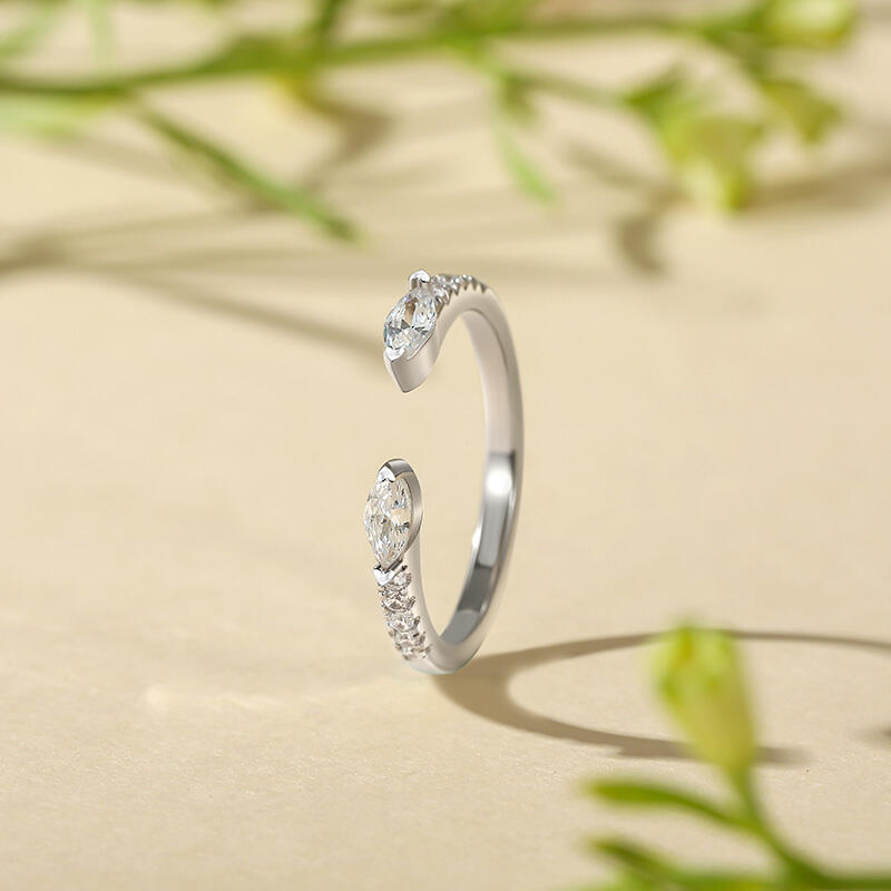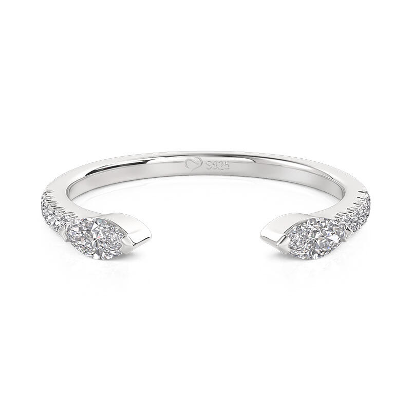 Dieser einfache offene stapelbare Frauen-Ehering mit eingefasstem Band ist ein perfektes Accessoire für jede Juwelenliebhaberin. Er hat zwei kleine marquise-förmige Steine an den Enden des offenen Bandes, die einen Hauch von Eleganz und Glanz hinzufügen. Die Fassung sorgt dafür, dass die Steine sicher in Position gehalten werden, während sie immer noch schön das Licht reflektieren. Dieser Ehering ist stapelbar konzipiert und kann sowohl allein getragen als auch mit anderen Ringen kombiniert werden, um ein einzigartiges Design zu erzielen. Ob Sie ihn mit einem Solitär oder anderen stapelbaren Bändern kombinieren, wird dieser offene stapelbare Frauen-Ehering Ihrem Schmuckbestand einen charmanten und stilvollen Akzent hinzufügen.